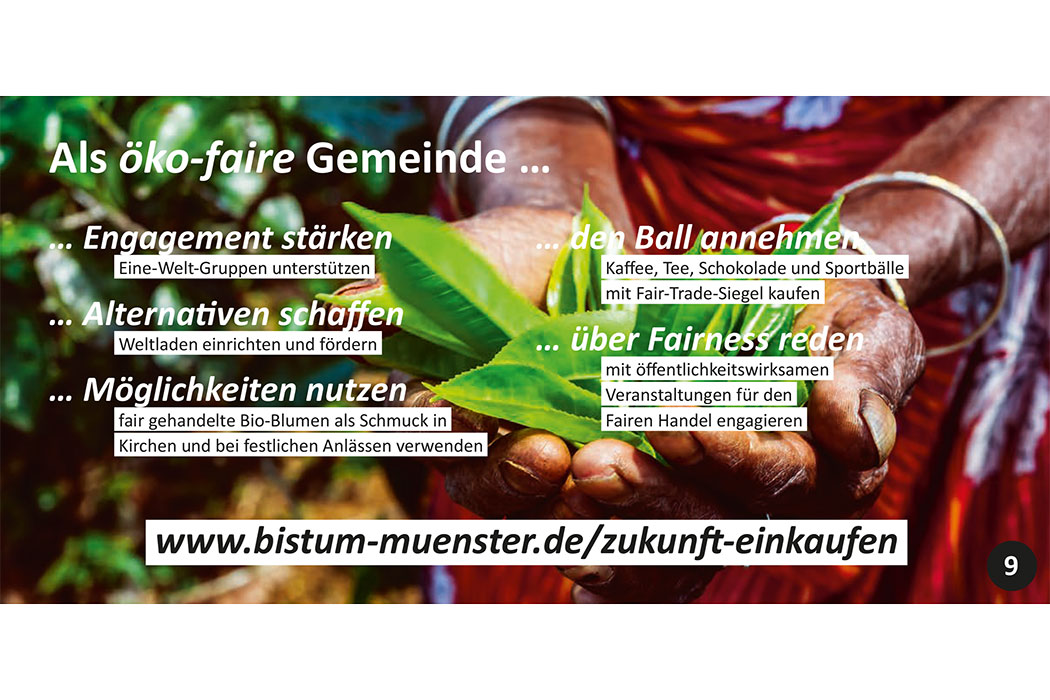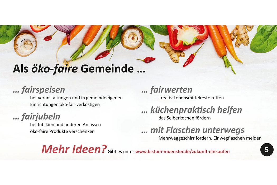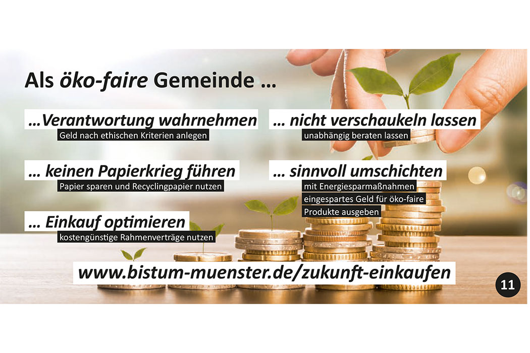 „Ökofaire Beschaffung und nachhaltiges Wirtschaften“ heißt das Zauberwort und dies wirkt sich auf die Bereiche der Gemeinde aus. Das heißt, es soll ökologisch, nachhaltig, fair und regional eingekauft und gewirtschaftet werden. Dies gilt in allen Bereichen der Gemeinde, auch in den ehrenamtlichen Bereichen und Gruppierungen.